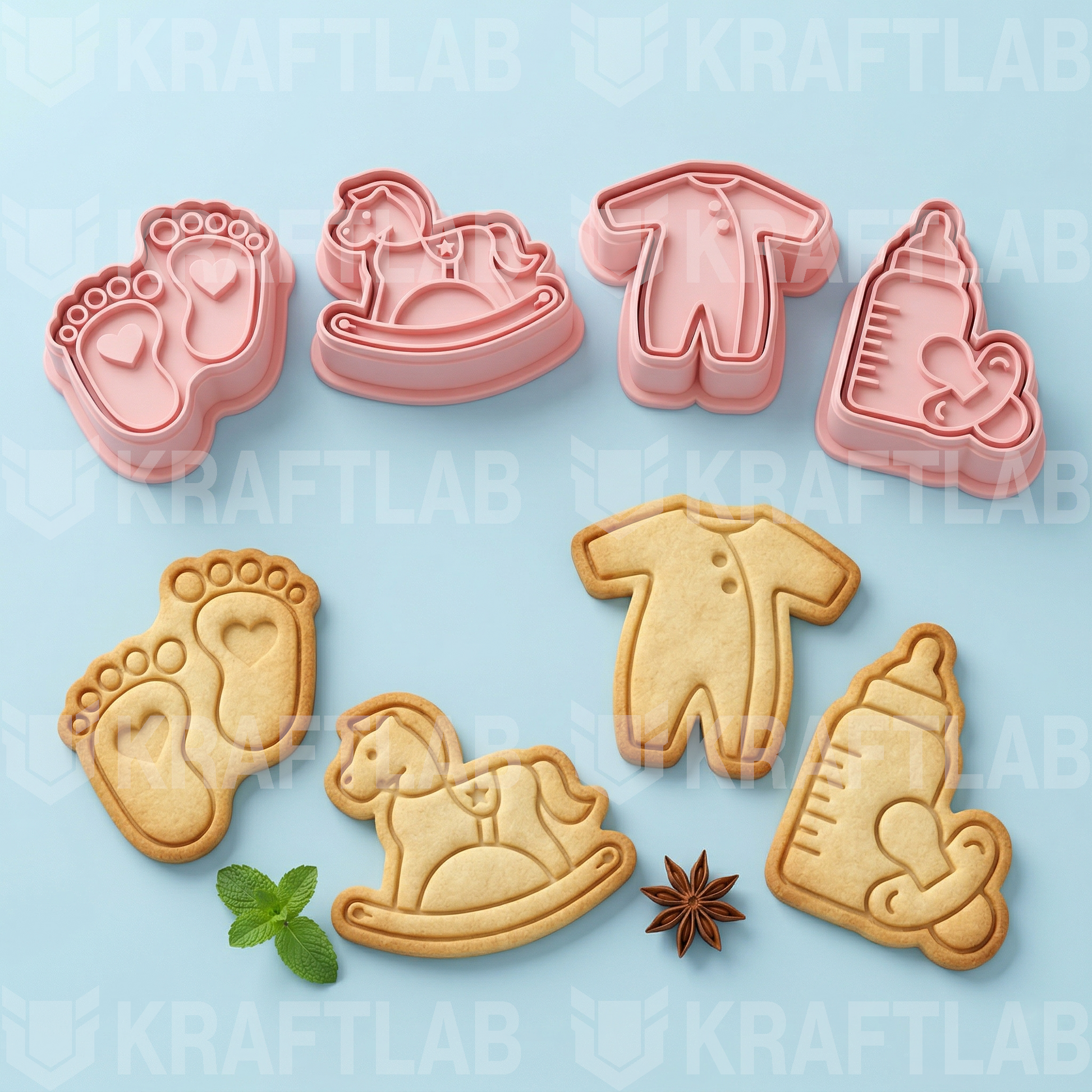 Kit com 4 cortadores de biscoito temáticos para chá de bebê, produzidos em impressão 3D com filamento PETG food safe. Cada peça é durável e segura para uso alimentar, perfeita para criar biscoitos decorados e personalizados em suas celebrações. Ideal para padeiros, confeiteiros e pais que desejam adicionar um toque especial aos doces do evento. Conjunto completo pronto para usar.