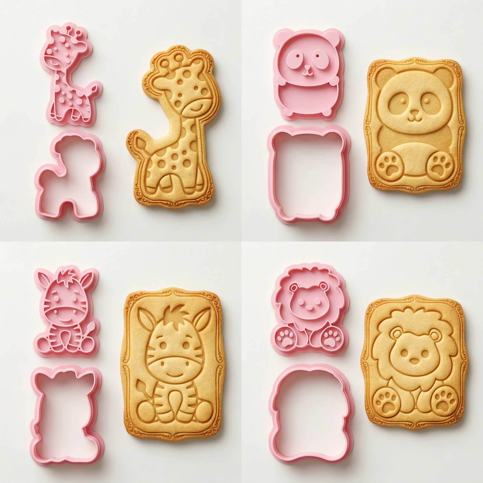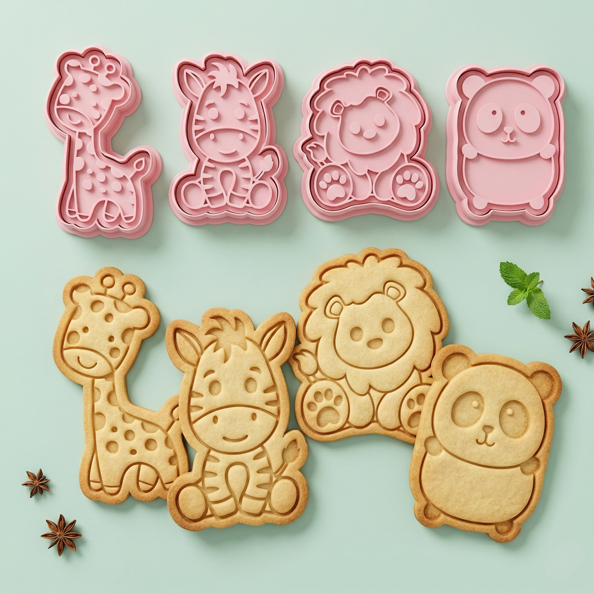 Transforme suas receitas em arte com este kit de cortadores de biscoitos em formato de animais fofos. Cada cortador possui um carimbo integrado que imprime o desenho diretamente na massa, garantindo biscoitos detalhados e encantadores sem esforço.